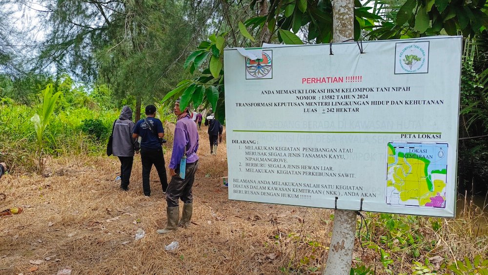 “Semalam, kami mendapati 2 orang aparat berambut cepak masuk ke dalam kawasan. Mereka mengaku suruhan dari pengusaha sawit dan membawa dokumen. Tapi mereka abai dengan plang SK Menteri terkait status kawasan yang kami kelola,” beber M Samsir, anggota Poktan Nipah, Selasa (21/10/2025) pagi.