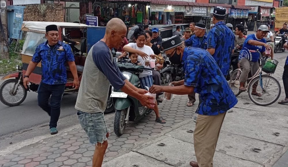 Bersama anggotanya, Ketua KOMBAT Deli Serdang H Jasa Wardani Ginting membagikan takjil di kawasan Sunggal.
