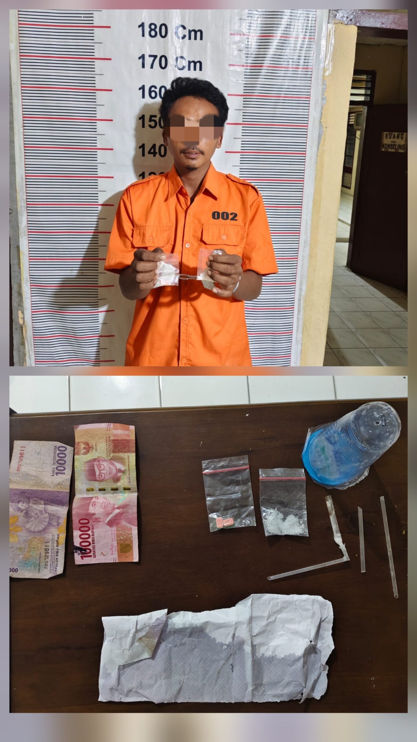 Dari hasil penangkapan, petugas berhasil mengamankan satu orang diduga pelaku berinisial R.A (31) beserta sejumlah barang bukti berupa narkotika jenis sabu, dua butir diduga ekstasi, alat hisap (bong), serta uang tunai dengan total berat bruto narkotika 2,08 gram.