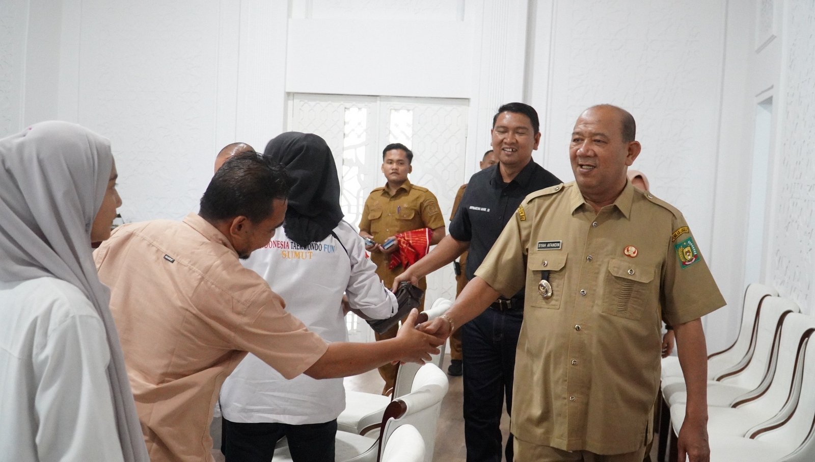 Langkat – Bupati Langkat, H. Syah Afandin, SH menerima audiensi dari Pengurus Indonesia Taekwondo Fun (ITFun) Propinsi Sumatera Utara, InOrga yang bernaung di bawah Komite Olahraga Masyarakat Indonesia (KORMI) dalam rangka membahas pengembangan pelatihan olahraga taekwondo di lingkungan sekolah di Ruang Kerja Bupati Kantor Bupati Langkat – Stabat, Selasa (7/4).