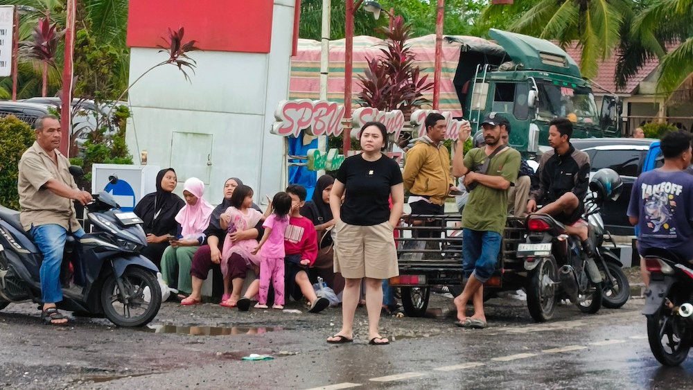 Mutia, salah seorang warga terlihat berjalan kaki di Jalan Lintas Sumatera (Jalinsum) Medan – Banda Aceh. Persisnya di Simpang Sosial, Desa Batu Melenggang, Kecamatan Hinai. Bersama temannya, ia membeberkan situasi di Kecamatan Tanjung Pura.