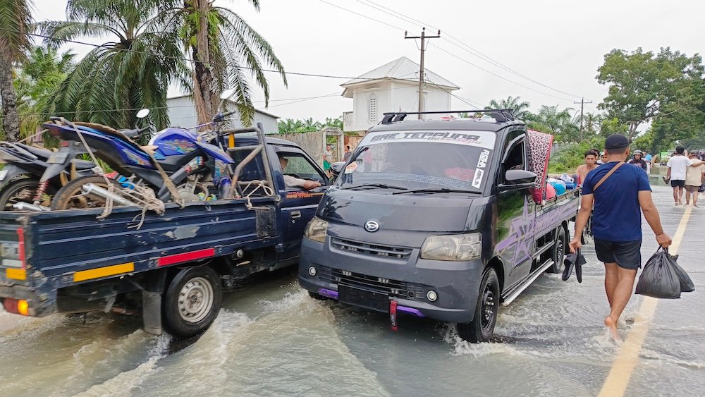 “Kami berjalan dari Paya Perupuk, Tanjung Pura mau ke Tanjung Beringin (Hinai). Airnya di tempat kami sudah setinggi dada. Arus airnya pun kencang kali,” ungkap Mutia diamini teman-temannya.